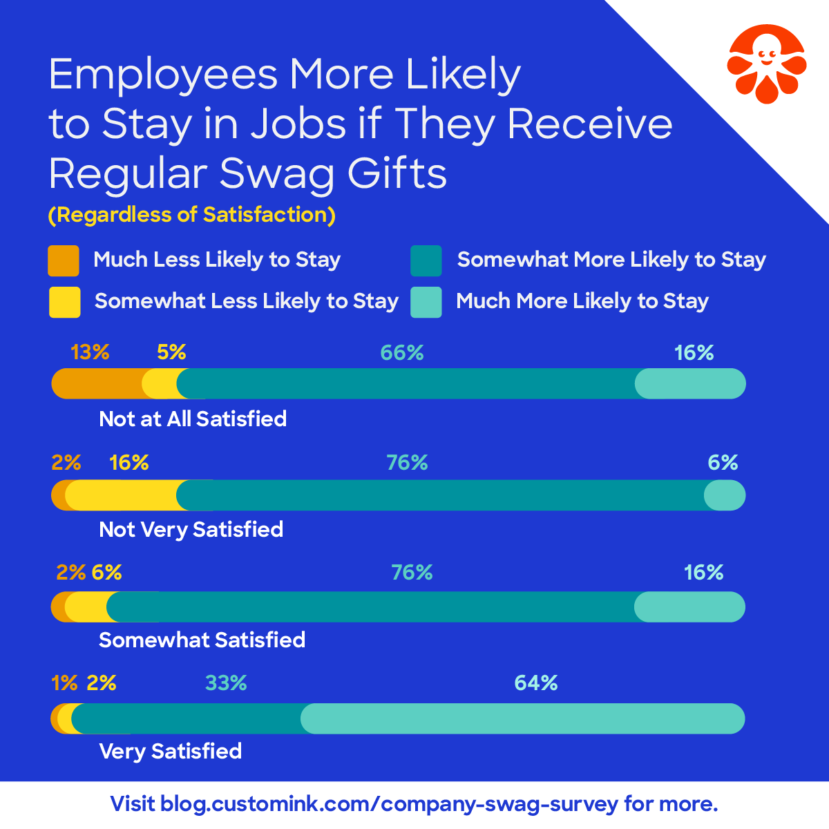 - Surprisingly, retention increased regardless of the employee’s current satisfaction level, as even 81% of dissatisfied employees said a preferred piece of swag would make them more likely to stay.