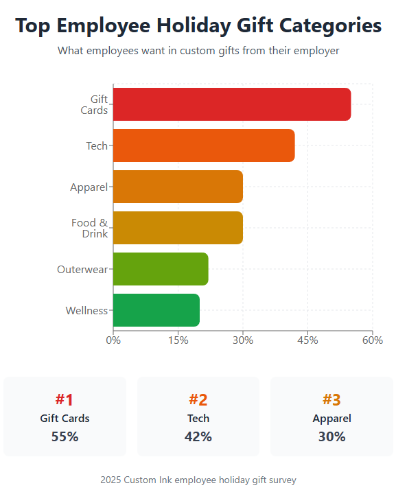 At Custom Ink, we know gifts that build connection mean everything. That’s one of the takeaways from our new 2025 Custom Ink Employee Holiday Gift Survey, which reveals what employees really want for their company gift (and what they definitely do not).