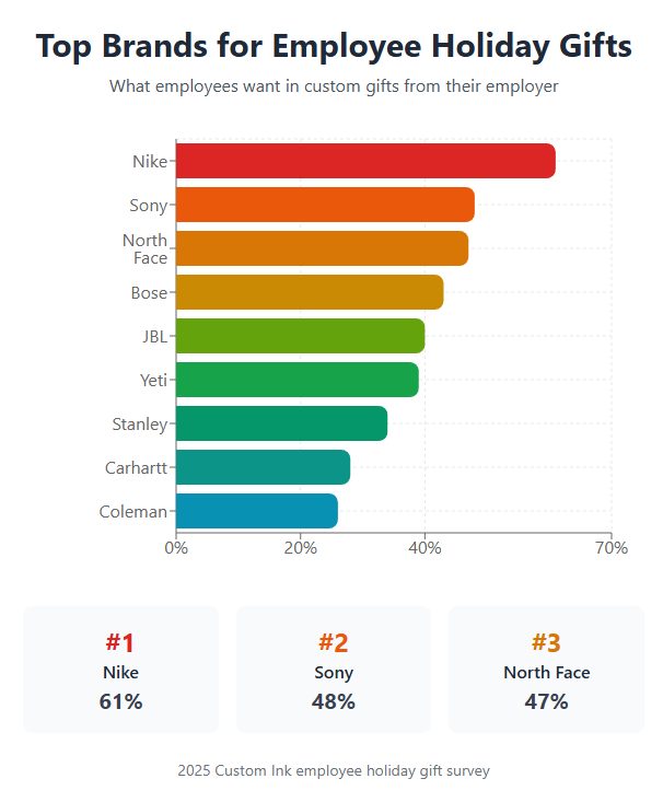 ![]() | Don’t: Buy No-Name Brands Choose a premium, well-known brand to earn points with your team. Our Custom Ink survey found that 76% of employees valued a gift more when it came from a trusted, high-quality brand. |